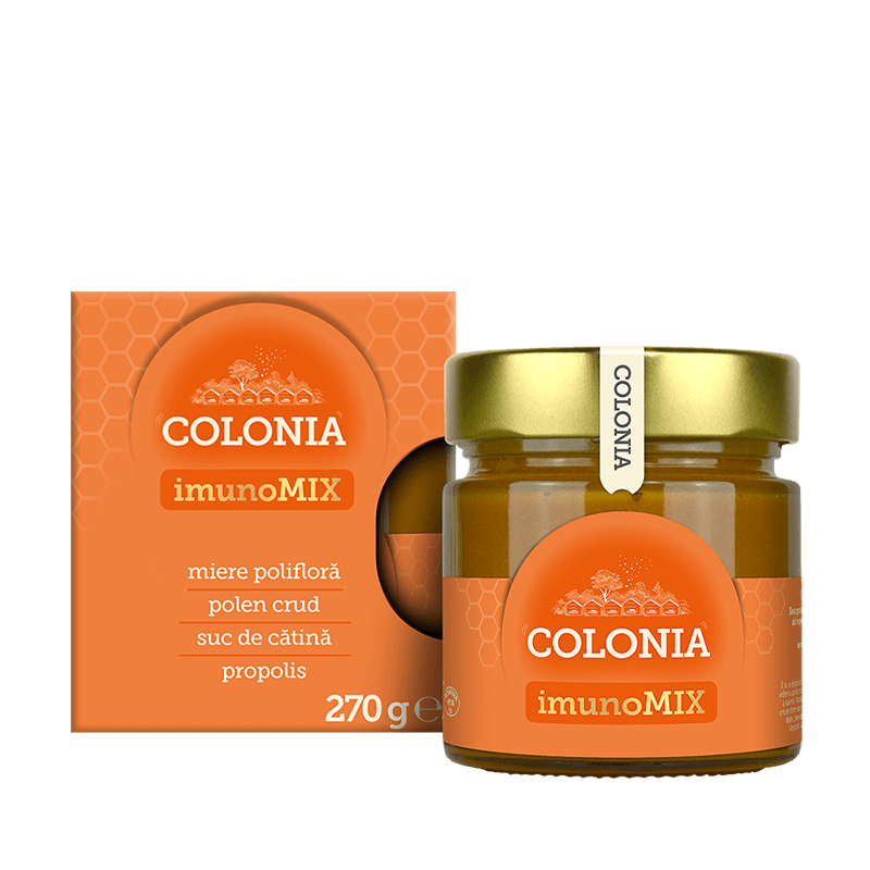 Imuno Mix Colonia încorporează 4 super-alimente, deoarece este un amestec natural de miere polifloră, suc de cătină, polen crud și propolis, cu numeroase beneficii pentru imunitatea organismului, fiind un complex de vitamine, minerale, proteine și substanțe cu rol antioxidant și antibiotic.